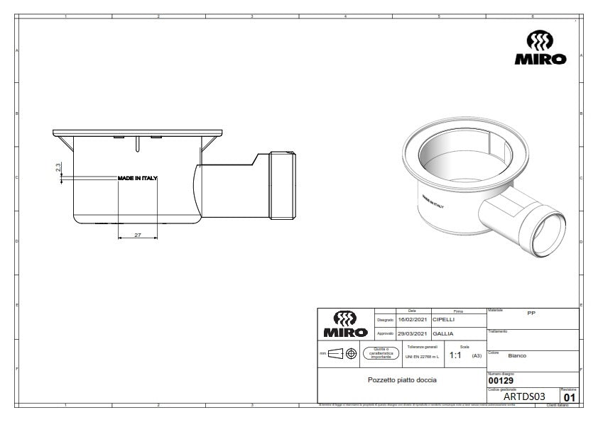 PP trapped waste for a90 holed tray c.p. ABS grid 0118-POM flange 0115 lateral outlet 1*½